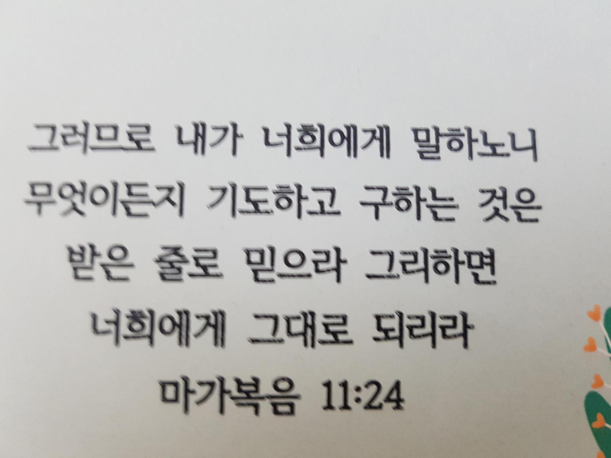 그러므로 내가 너희에게 말하노니 무엇이든지 기도하고 구하는 것은 받은 줄로 믿으라
